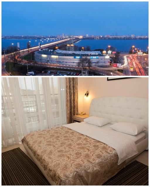 Staybridge Mini-Hotel in Most City PANORAMIC RIVER VIEW ให้บริการที่พักในนิปโปร ห้องพักติดตั้งเครื่องปรับอากาศมองเห็นวิวแม่น้ำและมาพร้อมกับโต๊ะและอินเทอร์เน็ตไร้สาย (WiFi) ฟรี ที่ Staybridge Mini-Hotel in Most City PANORAMIC RIVER VIEW...